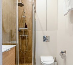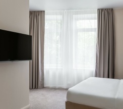 В номере: двуспальная кровать, шкаф, прикроватные тумбочки, настольная лампа, фен, холодильник, письменный стол, кресло-кровать, кондиционер, сейф, зеркало, кофе машина, чайник, бутилированная вода, чайный набор, халат, тапочки, теплый пол в ванной комнате, душевая кабина