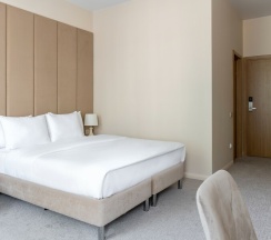 В номере: две односпальные кровати или двуспальная кровать, кресло-кровать, шкаф, прикроватные тумбочки, настольная лампа, фен, холодильник, письменный стол, кондиционер, сейф, зеркало, кофе машина, чайник, бутилированная вода, чайный набор, вафельный халат, тапочки, теплый пол в ванной комнате, душевая кабина, вид на город