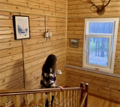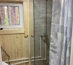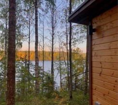 В доме: удобства (душ, туалет), мини-кухня, двуспальная кровать, шкаф, панорамное окно с видом на лес и озеро, раскладной диван, терраса со столиком и креслами.