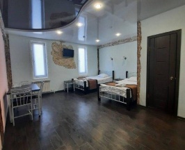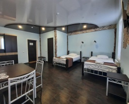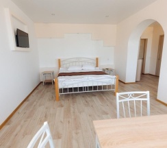 В номере: Двуспальная кровать размером 180*200, Раскладной диван, Две прикроватные тумбочки, Стол, Шкаф для одежды, Зеркало, Телевизор (цифровое ТВ), Бесплатный Wi-Fi, Санузел, Душ, Полотенца, тапочки, туалетные принадлежности.