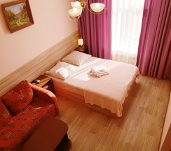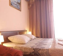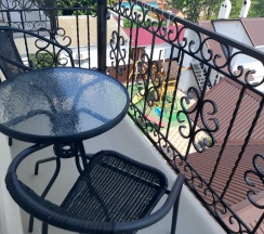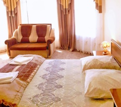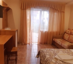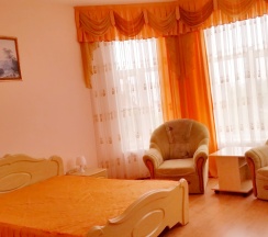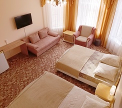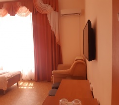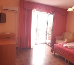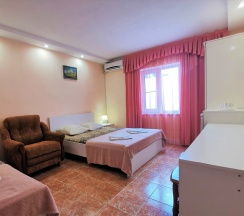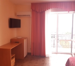 Однокомнатный семейный номер расположен в основном здании. Подходит для проживания пяти гостей. Главное преимущество данного номера это большой балкон. Также имеет всё необходимое для комфортного отдыха: двухспальная кровать, односпальная кровать или раскладной диван, кондиционер, холодильник, телевизор, санузел, душ.