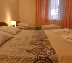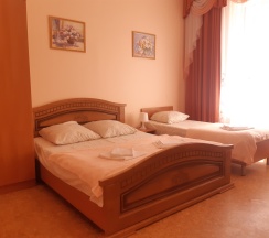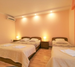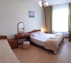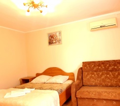 Однокомнатный трёхместный номер расположен в двухэтажном здании. Подходит для проживания двоих гостей с возможностью дополнительного размещения. Имеет всё необходимое для комфортного отдыха: двухспальная кровать, односпальная кровать или раскладной диван, кондиционер, холодильник, телевизор, санузел, душ.