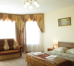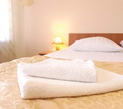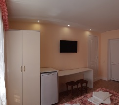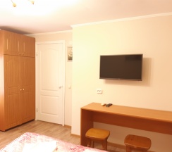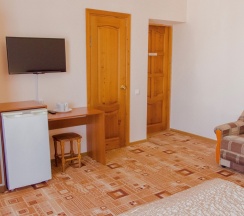 Небольшой уютный номер расположен в основном здании. Подходит для проживания двоих гостей с возможностью дополнительного размещения. Имеет всё необходимое для комфортного отдыха: двухспальная кровать, односпальная кровать или раскладной диван, кондиционер, холодильник, телевизор, санузел, душ.