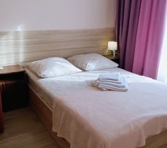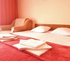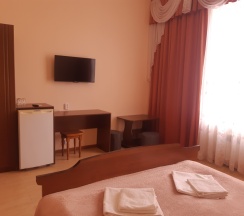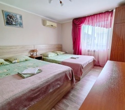 Однокомнатный двухместный номер расположен в двухэтажном здании. Подходит для проживания двоих гостей с возможностью дополнительного размещения. Имеет всё необходимое для комфортного отдыха: двухспальная кровать, односпальная кровать или раскладной диван, кондиционер, холодильник, телевизор, санузел, душ.