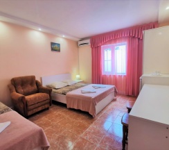 Однокомнатный пятиместный номер расположен в основном здании. Подходит для проживания пяти гостей. Имеет всё необходимое для комфортного отдыха: двухспальная кровать, односпальная кровать или раскладной диван, раскладное кресло, кондиционер, холодильник, телевизор, санузел, душ.