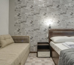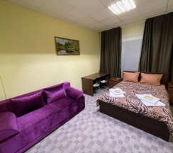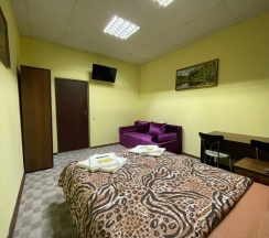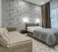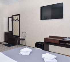 Уютный, просторный номер с двухспальной кроватью и диваном. Ванная комната общая. Имеются прикроватные тумбочки, светильники, плазменный телевизор.