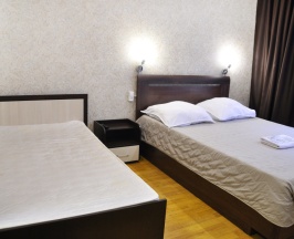 Уютный, просторный номер с тремя раздельными кроватями. Ванная комната общая. Имеются прикроватные тумбочки, светильники, плазменный телевизор.