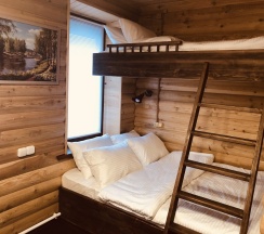 Трехместный номер с двуспальной кроватью и с двухъярусной широкой кроватью. Постельное белье белоснежное,. Одеяло и подушки из лебяжьего пуха.