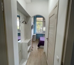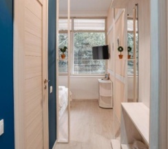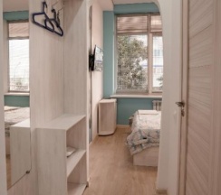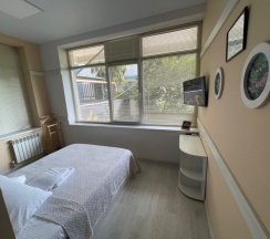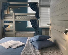 Проживала в общей женской комнате на восемь мест. Мне есть, с чем сравнивать, часто жила в Сочи в таких номерах с такой же ценой, и этот хостел показался лучшим. Плюсы: везде очень чисто (по территории хостела даже ходить нужно в бахилах либо в сменке), убирают каждый день; обстановка красивая; персонал очень милый и вежливый; кровати крепкие и удобные, на них есть шторки, так что даже в небольшой комнатке легко уединиться, у каждой кровати есть полочка, розетка и лампа, в других хостелах этой ценовой категории о таком только мечтать, как и о том, что дают два полотенца; шкафчики с вещами закрываются на ключ; постельное также чистое и приятно пахнет; интренет хороший, хотя иногда отваливался; кондиционер работает постоянно, во всём хостеле прохладно; есть утюг и гладильная доска. На первом этаже есть кафе с приемлемыми ценами и вкусной едой. Рядом с хостелом полно магазинов, кафе и прочего. Минусы: в ванной нет фена и стиралки; только одна уединённая ванная комната; в комнате темно и замкнуто, так как окна только под потолком и закрыты жалюзи; далеко до остановки, до центра, до пляжей