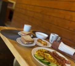 Во первых хочу сначала отдельно поблагодарить за наш отдых администратора Тамару🩷Это настолько приятный, добрый и отзывчивый человек, просто невообразимо, спасибо!!! А теперь про базу, нас было четверо 2 взрослых(мама, папа😁) и дети как вы поняли двое 😁Брали бунгало на 4 человека, притом, мы бронировали на трое суток, нам понравилось и мы продлили ещё на 3 дня. В домике, душ (есть мыло, шампунь и гель для душа) туалет, посуда, чайник, шкаф. Для детей двухярусная кровать в отдельной комнате. Тёплые полы, это кстати круто, если промочили ноги и обувь промокла, за ночь она высохнет! На веранде столик где можно вечером посидеть, отдохнуть или утром выпить кофе и насладиться видами. Нам было Супер комфортно! Завтраки очень классные, блинчики и омлет безумно вкуснющие 👌 В день заезда, наш домик ещё не успели убрать, мы приехали рано, нас попросили немного подождать пока убирают(кстати уборка на высоте, белоснежное белье и полотенца, что отметил даже муж) и чистили даже мангал в течение отдыха😯 Так вот, я просто спросила про утюг и фен, можно ли их взять где-то на базе, сказали что в домике нет, но если попросить дадут. И когда мы уже часа через 1.5 вернулись заселяться в чистый домик, фен и утюг были у нас в номере 🥰 Вот это я понимаю сервис, когда ты просто спросил, а для тебя это приготовили к приезду. Детям было не скучно, на территории веселые петух и курочки, почти ручные овечки/барашки, которые едят с рук. Детская площадка. Вообщем спасибо огромное за отдых . Обязательно вернемся к вам ❤