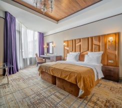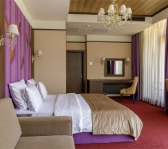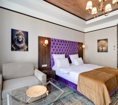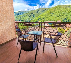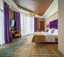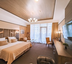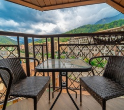 Дизайнерский номер Deluxe на двоих с балконом и видом на горы. Площадь номера составляет 26м2. Гости имеют свободный доступ к посещению SPA комплекса, уличного бассейна и тренажерного зала.