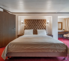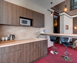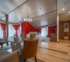 Современный двухкомнатный номер Superior Chalet, оснащен двуспальной кроватью размера King size, большой гостиной, балконом, просторной ванной комнатой, кухней, обеденной зоной и зоной для отдыха. Подходит для размещения гостей в количестве до 4х человек. Гости имеют свободный доступ к посещению SPA комплекса, уличного бассейна и тренажерного зала.