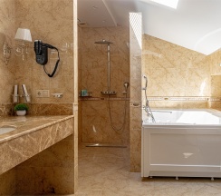 Роскошный двухкомнатный номер Executive Suite с джакузи, оснащен двуспальной кроватью размера King size, просторной гостиной, двумя балконами, большими ЖК телевизорами, ванной комнатой с джакузи, кухней и обеденной зоной. Подходит для размещения гостей в количестве до 4х человек. Гости имеют свободный доступ к посещению SPA комплекса, уличного бассейна и тренажерного зала.