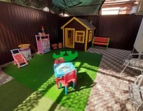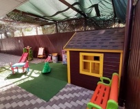 Небольшая зона отдыха под навесом и игровая площадка.