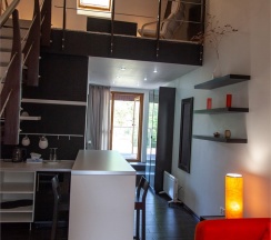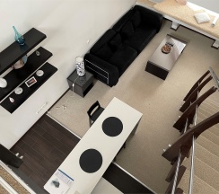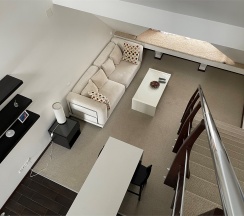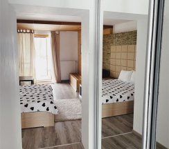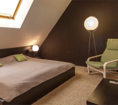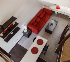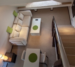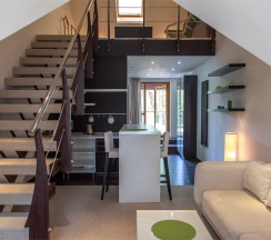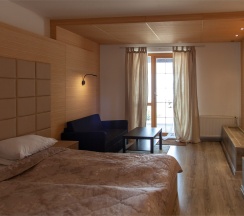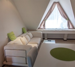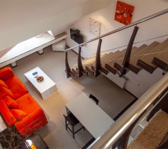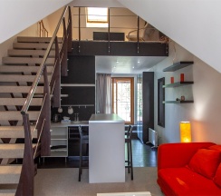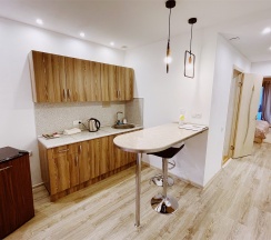 Комфортабельный двухуровневый номер с выходом на верхнюю террасу гостиницы. На нижнем этаже номера располагается прихожая, ванная комната, мини-кухня (посуда, стекло, приборы на 4 персоны), чайник, чайный набор, микроволновка, гостиная с диваном, телевизор.