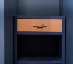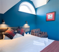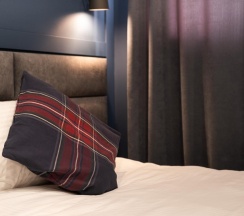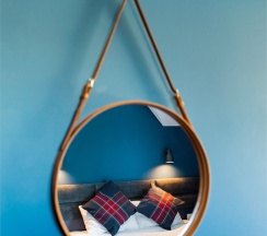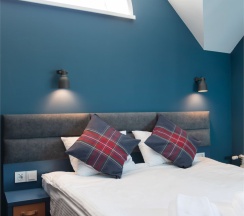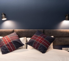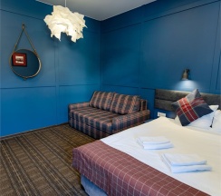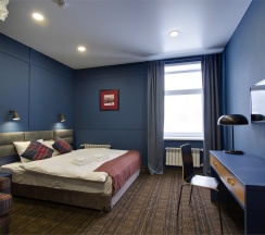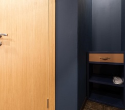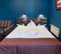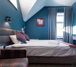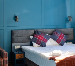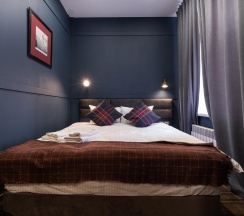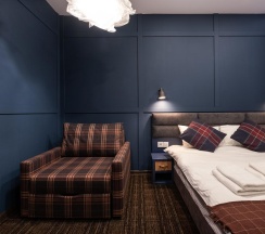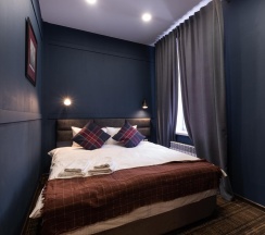В комнате: одна двуспальная кровать (ширина 160 см.), тумба, вешалка для одежды, зеркало.