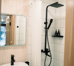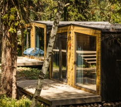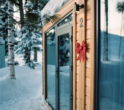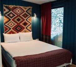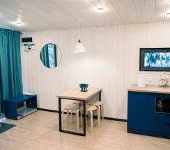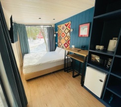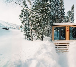 Комфортабельный модульный дом, находится среди заснеженных пихт. В доме есть удобная двуспальная кровать и диван, который раскладывается и превращается в полноценное спальное место, микроволновая печь, холодильник, чайник, посуда, комод, шкаф, телевизор, кухонный стол, стулья, душ, туалет, фен.