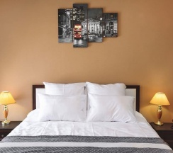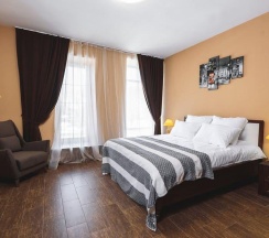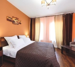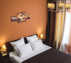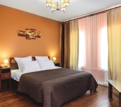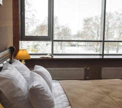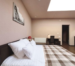 Стандарт - это просторные светлые комнаты с большой двуспальной кроватью. В каждой комнате: две прикроватные тумбочки, письменный стол, кресло, кофейный/журнальный столик, напольная вешалка, шкаф для одежды, зеркало, мини-холодильник.
