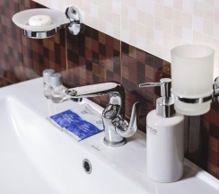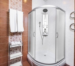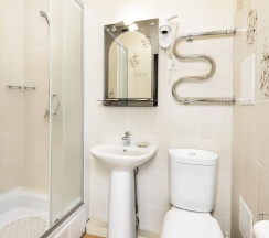 Просторные ванные комнаты оборудованы раковиной, унитазом, душевой кабиной, феном, зеркалом.