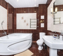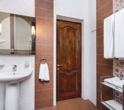 Просторные ванные комнаты оборудованы унитазом, раковиной, душевой кабиной, феном, зеркалом.