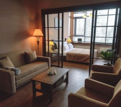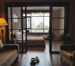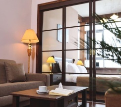 Комнаты разделены стеклянной перегородкой. В комнате: большая двуспальная кровать, две прикроватные тумбочки, диван и два кресла, журнальный стол (обеденный стол), шкаф для одежды, зеркало, мини-холодильник.