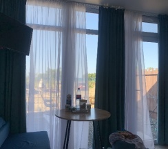 Панорамные окна с обоих сторон чистые, вид шикарный, есть шторы блэкаут при необходимости.