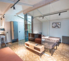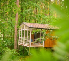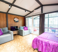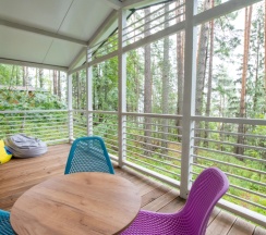Двухэтажный комплекс, окружённый соснами. Номер с двуспальной кроватью, окна с видом на лес. Рядом детская игровая площадка, а также батут и бассейн. Поблизости общая кухня. Комплекс идеально подходит для проживая с детьми.