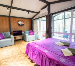 Стандарт ЛЮКС №3: 2 этаж, вид на лес, большая кровать, возможно дополнительное место, гостиная с большим диваном, шкаф, санузел, мини кухня: микроволновка, индукционная плитка, ложки, вилки, поварёшки, открывашка, нож, тарелки, кружки, разделочная доска, полотенце, чайник, средства для мытья посуды, сковорода, кастрюля. Столовые приборы на 5 персон.
