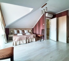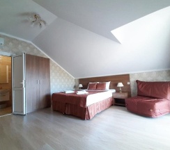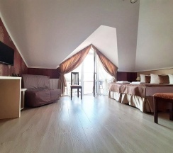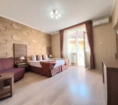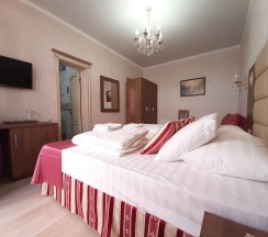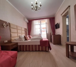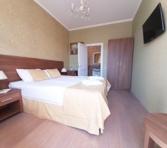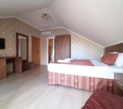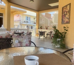 Очень понравилось тут отдыхать! Гостеприимная хозяйка, вежливая горничная. Дом очень красивый и ухоженный, территория тоже, есть общая Терраса на втором этаже, на первом - места для отдыха, детская зона, мангальная, качели…Жили в 12 номере на 3 этаже, самый лучший как по мне) нет рядом соседей, выходишь на балкон и рядом никого👌🏼 номер не большой но есть все что нужно: большая удобная кровать, раскладной диванчик, кондиционер, стол, телевизор (хорошо бы кабельное, а то только стандартные каналы и бывает не работают), маленький холодильник, большой шкаф и туалетный столик👍🏼 ванная комната кстати просторная и чистая👍🏼 за 5 дней проживания 2 раза была проведена поддерживающая уборка👍🏼 в общем нам было прям хорошо у вас🙌🏼 кстати, находится дом рядом с морем, но местный пляж не рекомендую… лучше доехать до других