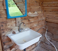 Один душ и адекватный туалет (уличный, но с унитазом полноценным с гидрозатвором и запаха нет). Домики не большие, шкафов нет.