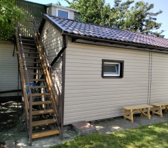 Номер Делюкс расположен на 2 этаже коттеджа и имеет отдельный вход.Хорошая качественная мебель,новые матрасы,телевизор,кондиционер,платяной шкаф,столик со стульями холодильник,свой сан узел с душевой.В гостинице,для удобства отдыхающих имеется кухня,работающая круглосуточно.На кухне есть все,что может потребоваться хозяйке для приготовления пищи.Кроме 5 столиков на кухне,можно покушать на природе под декоративным навесом.Для быстрого разогрева пищи взрослым и детям установлена микроволновая печь.С горячей и холодной водой у нас нет проблем,в гостинице своя насосная станция.Парковка для авто на улице,места много.
