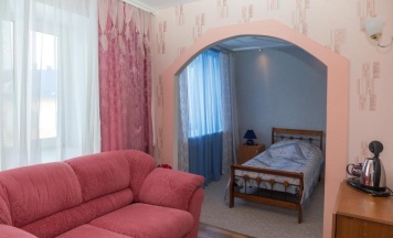 Помещение уютного номера напоминает небольшую двухкомнатную квартиру, в которой есть гостиная, спальня и санузел.