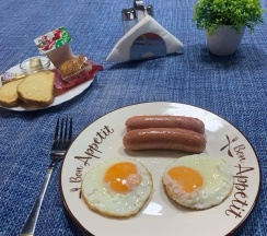 Завтрак - яичница с ветчиной + йогурт, кексик, плавленые сырки и яблоко. Чай и кофе (растворимый) не ограничено.
