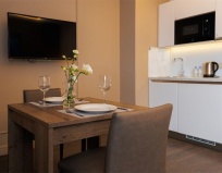 Номер маленький, уютный, кухня наполнена всем необходимым (2 ножа, открыашка, кастрюля и сковородка), фужеры, бокалы, свч, стиралка кондиционер...удобно что есть большоц полотенце сушитель (вещи ребенка быстро сохли после стирки), много сценариев освещения.