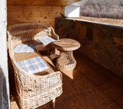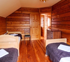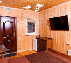 Стандартный трехместный номер с 1 двуспальной кроватью и 1 односпальной. В номере душ, туалет, телевизор, минихолодильник, чайник, чашки, стаканы, ложки, столик, стулья, комод. Номер выходит на общую террасу, с которой открывается вид на горы, лес, реку, а также внутренний дворик.
