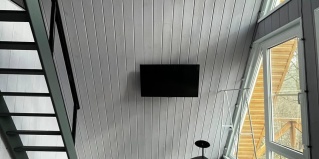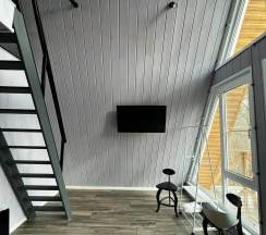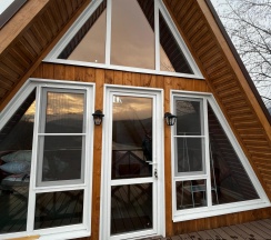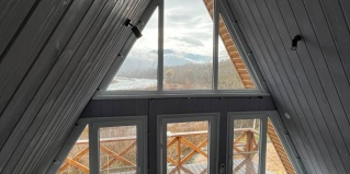 Домик треугольник с собственной террасой. Терраса оборудована для комфортного пребывания шезлонгами и столиком. В домике 2 этажа, единое пространство. На верхнем этаже расположена двуспальная кровать, на первом этаже зона отдыха с кухонной зоной, диваном, который раскладывается в двуспальное место. Кухня оборудована посудой, раковиной, холодильником, микроволновкой, но нет плиты. Готовить необходимо на кухне общего пользования, которая расположена на территории гостевого дома. Из домика открывается панорамный вид на горы и реку.