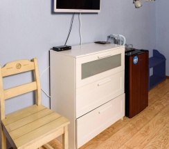 Двухместный улучшенный номер с 1 двуспальной кроватью. В номере душ, туалет, телевизор, минихолодильник, чайник, чашки, стаканы, ложки, полотенца, постельное белье.