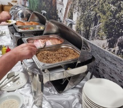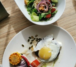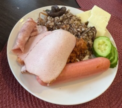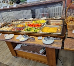 Завтрак - шведский стол с хорошим выбором. Есть жареный бекон, несколько видов каш, запеченые овощи, на выбор фрукты. По желанию можно попросить шампанское.