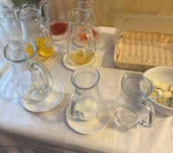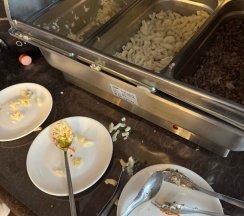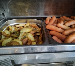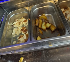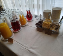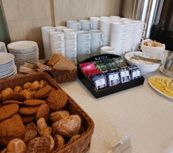 Завтрак (шведский стол) с 7-10 утра. Достаточно разнообразен (каша, хлопья, омлет, запеканка, блинчики разные, сосиски, картофель дольками, нарезки и салаты, печенья разные. Напитки в ассортименте: молоко, кефир, йогурт, соки, чай и кофе (американо/эспрессо). Из фруктов яблоки. Говорят к 9 часам разнообразия уже нет, но мы были рано.