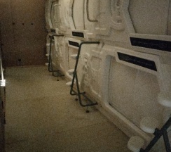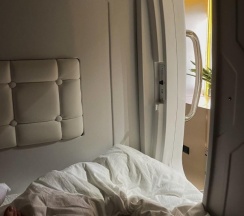 Поселили на нижнюю капсулу я человек не молодой, двери туалета были с другой стороны капсулы поэтому была тишь да гладь. Матрас мягкий бельë чистое.