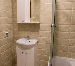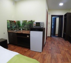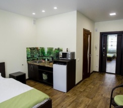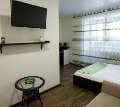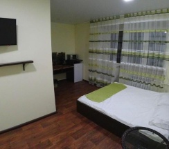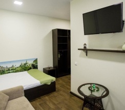 Двухместный номер с одной двухспальной кроватью. В номере: телевизор, кондиционер, холодильник, микроволновая печь, чайник, кофемашина, стиральная машина, утюг, посуда, балкон и собственная ванная комната.