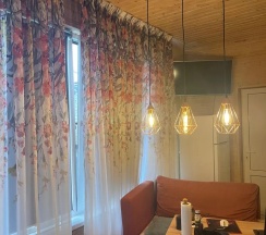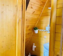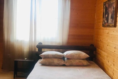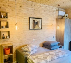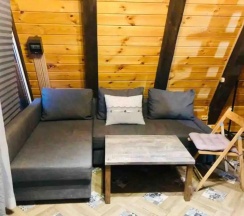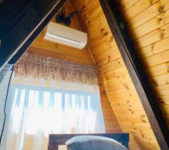 2- х этажный дом выполнен в скандинавском стиле. На первом этаже гостиная совмещённая с кухней, баня на дровах (за дополнительную плату), панорамные окна, кухонный гарнитур, угловой диван, санузел (туалет и душевая), вся современная бытовая техника, плазменный тв, микроволновка, вся посуда, холодильник, стиральная машина, сплит система. На втором этаже 2-х спальная кровать.