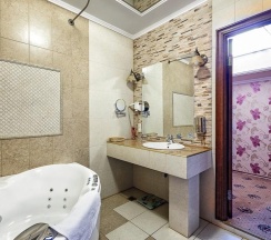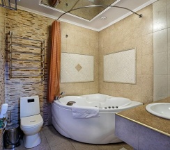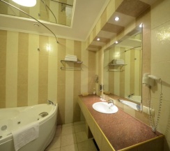Двуспальная кровать, плоский телевизор на стене(спутниковые каналы), сейф,мини-бар,поднос гостеприимства, ванная комната с джакузи, фен