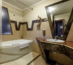 Двуспальная кровать, плоский телевизор на стене(спутниковые каналы), сейф, мини-бар, поднос гостеприимства, ванная комната с джакузи, фен.