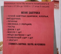 Достойный хостел с отличным сервисом! Чистые и уютные номера, удобные кровати. Персонал очень внимательный и заботливый. Завтраки вкусные и разнообразные. Расположение города – огромный плюс. Рекомендую всем, кто ищет комфортное и доступное проживание !