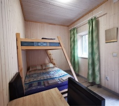 Трёхместный семейный номер с двухъярусной кроватью, на которой есть как двухспальное место, так и место на верхнем ярусе. В номере также есть стулья и вешалка. Доступ в номер осуществляется через отдельный вход с улицы.