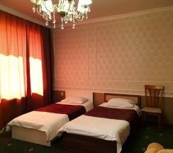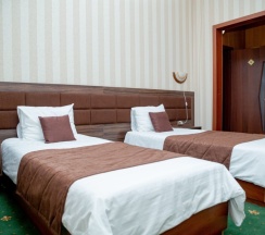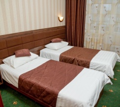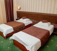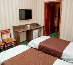 Просторный двухместный номер категории «Стандарт» позволит с комфортом разместиться 1-2 гостям. Здесь есть все для полноценного, качественного отдыха: 2 односпальные кровати, тумбы, шкаф, холодильник с мини-баром, ЖК телевизор, стол, стулья. Современный дизайн и новая мебель создают уютную атмосферу, которая поможет расслабиться любому гостю. В персональной ванной находится душевая кабина, раковина, унитаз, фен, туалетные принадлежности.