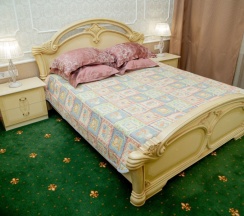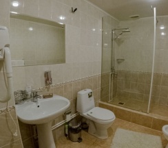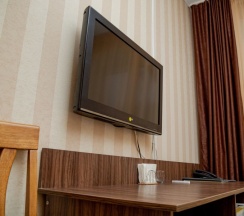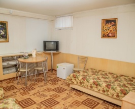 Просторный двухместный номер категории «Стандарт» позволит с комфортом разместиться 1-2 гостям. Здесь есть все для полноценного, качественного отдыха: 1 двуспальная кровать, тумбы, шкаф, холодильник с мини-баром, ЖК телевизор, стол, стулья. Современный дизайн и новая мебель создают уютную атмосферу, которая поможет расслабиться любому гостю. В персональной ванной находится душевая кабина, раковина, унитаз, фен, туалетные принадлежности.