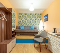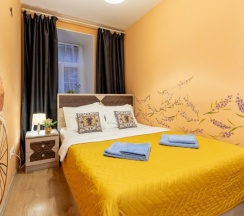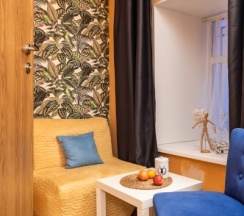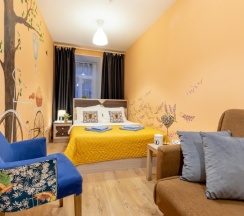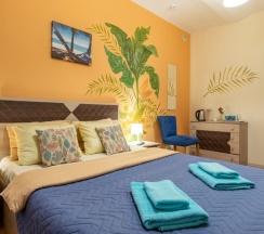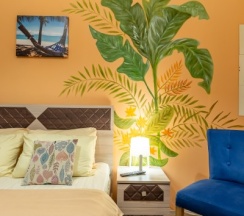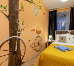 Каждый номер нашего отеля имеет индивидуальный дизайн, стены превращены в огромные картины с позитивными жизнеутверждающими мотивами. В этом просторном семейном номере могут разместиться до 4-х человек.
