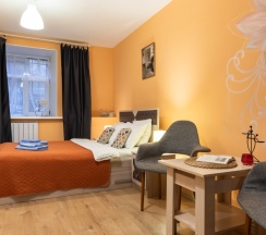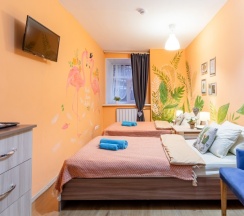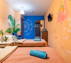 Каждый номер нашего отеля имеет индивидуальный дизайн, стены превращены в огромные картины с позитивными жизнеутверждающими мотивами. В этом двухместном номере могут разместиться до 3-х человек.